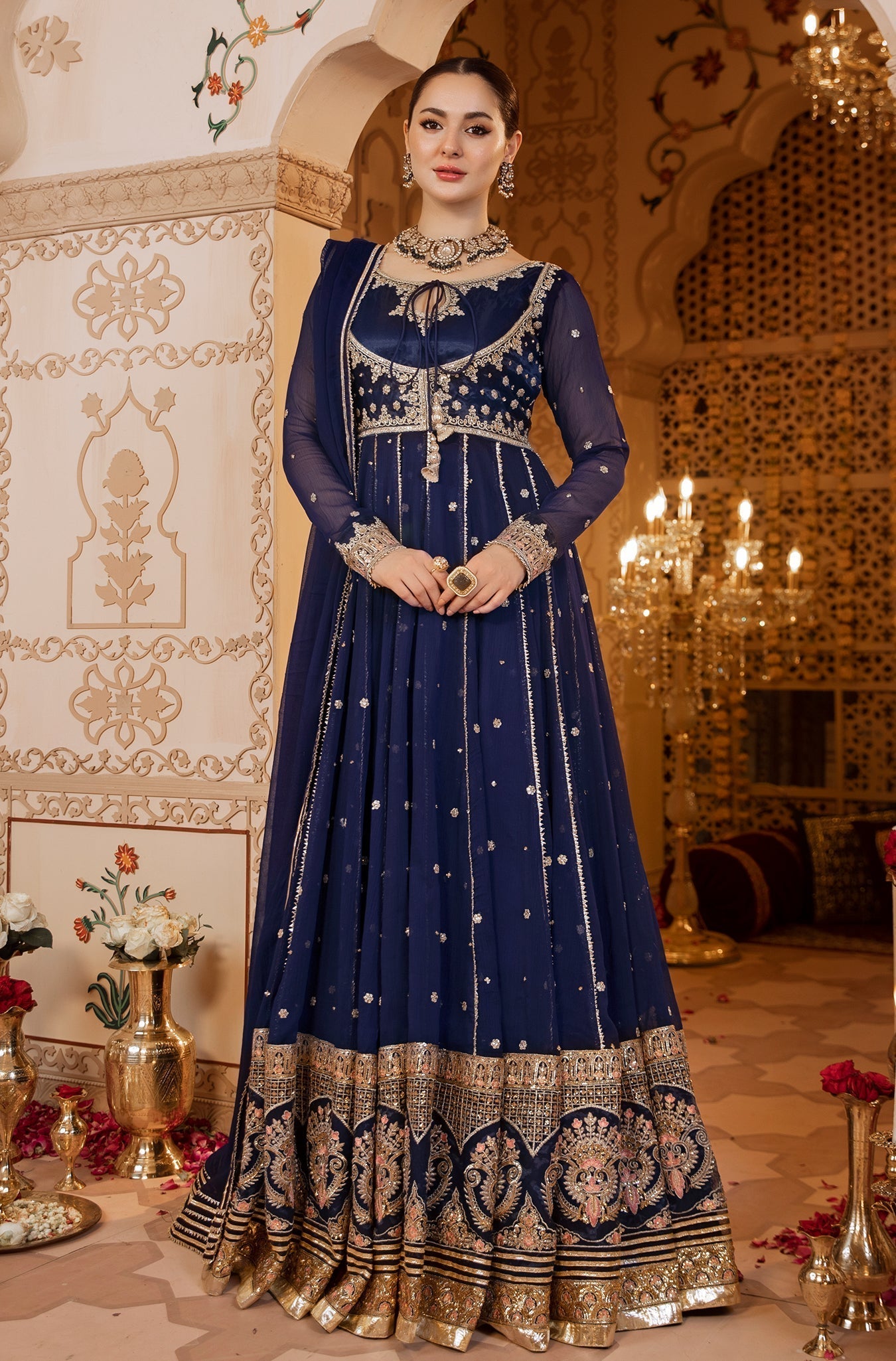 Luxurious Fabric: Crafted from a lightweight yet luxurious fabric, this navy blue anarkali dress offers an elegant drape that ensures both comfort and grace. The voluminous, full-length skirt creates a flowing silhouette, making this blue long frock an ideal choice for weddings, cultural events, and formal celebrations. Its airy texture allows ease of movement, perfect for long hours at any festive gathering.